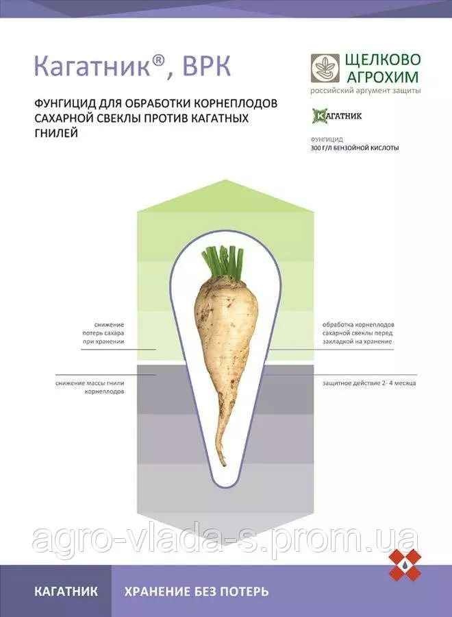 Фунгіцид, призначений для обробки коренеплодів цукрових буряків проти кагатних гнилей перед закладкою на зберігання бульб картоплі проти комплексу хвороб перед посадкою і закладанням на зберігання.