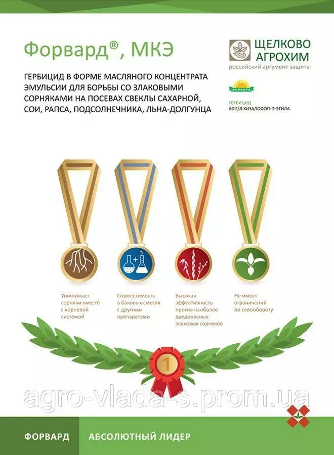 культур, но уничтожает однолетние и многолетние злаковые сорняки, в
