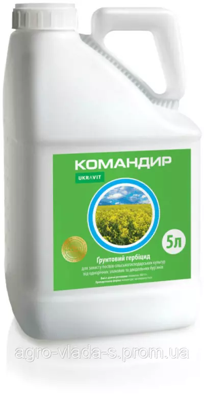 Обприскування ґрунту проводитися до посіву, відразу після посіву або протягом перших трьох днів після посіву. При недостатній вологості ґрунту після внесення препарату доцільно провести заробку препарату за допомогою легких борін чи іншого знаряддя, при цьому глибину заробки потрібно коригувати з глибиною загортання насіння культурних рослин. Вирівняна, дрібногрудкувата поверхня ґрунту, якісне та рівномірне його покриття разом з високотехнологічними операціями вирощування культури — обов'язкова умова для отримання максимальних результатів. Норма внесення препарату залежить від вмісту гумусу в ґрунті: на ґрунтах з невисоким вмістом гумусу рекомендовано застосовувати зменшені норми препарату. У посівах сої після застосування КОМАНДИР, діюча речовина блокує формування фотосинтетичних пігментів хлорофілу та каротину, що в результаті призводить до побіління бур'бур'янів, а згодом до загибелі. Для повноцінного знищення бур'бур'янів головним умовою – є застосування у ранні фазі зростання бур'бур'янів (дводольні 2-4 листочки, злакові 3-4 листочки). У разі зміни кольору першої пари листків культури після застосування препарату, забарвлення зникає протягом короткого часу, не впливаючи негативно на розвиток і ріст рослин. У зв'язку із високою летючістю препарату при застосуванні післясходово у посівах сої обов'язково дотримуватись правил щодо зносу робочого розчину на сусідні культури і швидкість вітру 1 м/с, менша швидкість руху обприскувача та висота штанги від поверхні ґрунту мінімальна