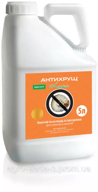 Контактно-системна дія. До складу препарату входять три інсектицидні діючі речовини нового покоління, які взаємодіють та доповнюють одна одну. АНТИХРУЩ ЛЮКС контактно-кишкової дії вражає центральну нервову систему шкідників, блокуючи функції життєдіяльності, що призводить до їх швидкої загибелі. Крім цього, АНТИХРУЩ ЛЮКС опосередковано знижує ї зараження рослин хворобами, оскільки ефективно діє на шкідників, які не тільки пошкоджують культуру, але й створюють сприятливі умови для розвитку вторинної грибкової та вірусної інфекції. Таким чином, завдяки своїй комбінованій дії препарат забезпечує надійний захист цілого ряду культур від комплексу шкідників