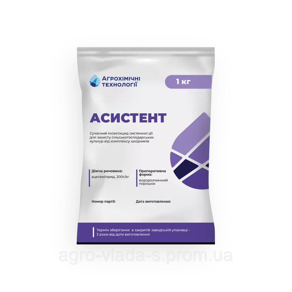 Ацетаміприд належить до класу неонікотиноїдів. Блокує постсинаптичні нікотинілові рецептори, перериваючи тим самим передачу нервових імпульсів, що веде до ураження нервової системи і загибелі комах від перезбудження і паралічу. Препарат поглинається рослиною і рухається по всім її частинам. Ефект від застосування проявляється і на необроблених частинах рослини. Шкідники гинуть як від безпосереднього контакту з препаратом, так і від поїдання оброблених частин рослини. Асистент проявляє дію на дорослих комах, личинок та яйця в залежності від виду комах.