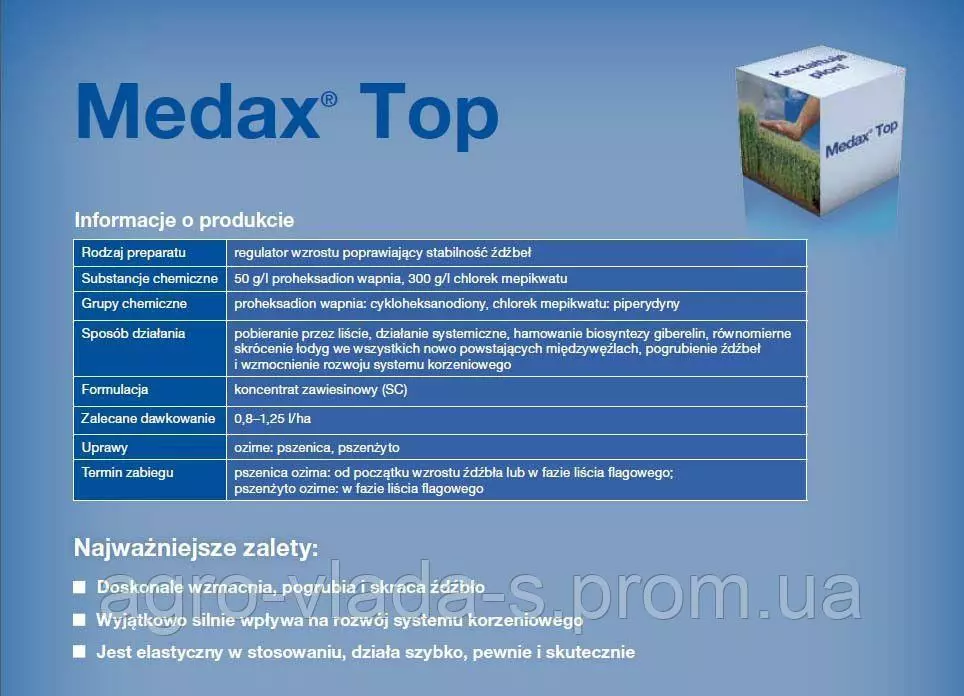 Для досягнення максимального рістрегулюючого ефекту Медакс Топ доцільно застосовувати у поєднані з сульфатом амонію у зпіввідношенні 1 : 1.